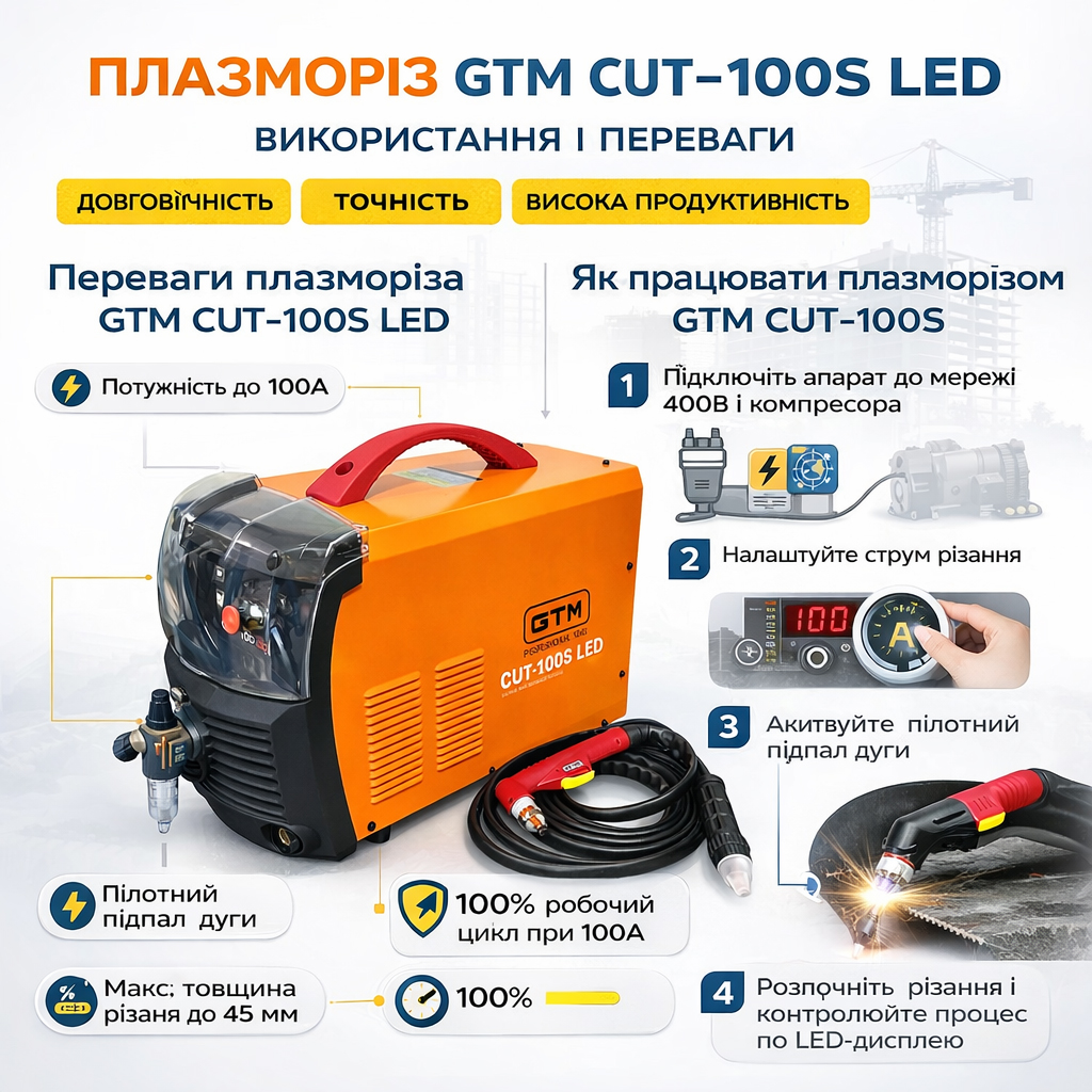 Плазморіз GTM CUT-100S використовує стиснене повітря, що робить процес безпечнішим і економічнішим у порівнянні з газо-кисневим різанням. Вбудований пілотний підпал дуги дозволяє працювати навіть із забрудненими або пофарбованими поверхнями.