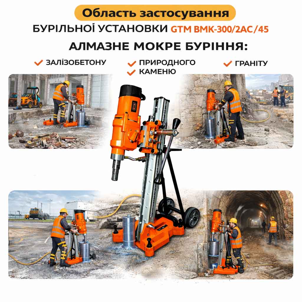 Алмазна бурильна установка GTM BMK-300/2AC/45 використовується у професійному будівництві та інженерному монтажі для створення технологічних отворів у твердих матеріалах.