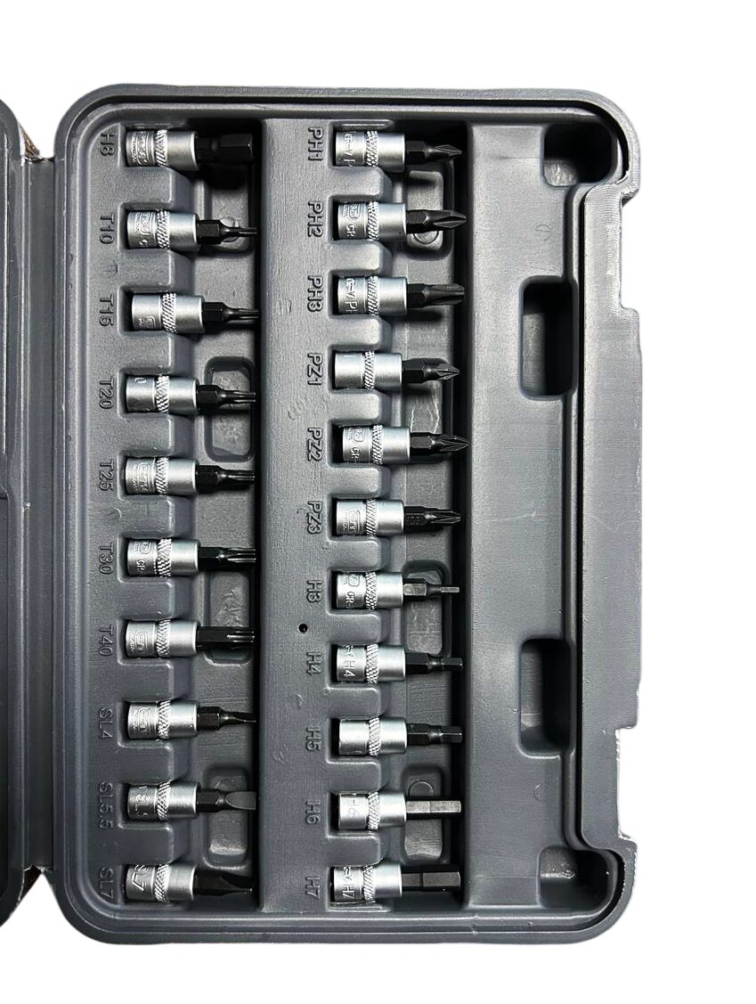 - Торцеві біти 1/4″: PH1, PH2, PH3, PZ1, PZ2, PZ3, H3, H4, H5, H6, H7, H8, SL4, SL5.5, SL7, T8, T10, T15, T20, T25, T30, T40 (22 шт.)