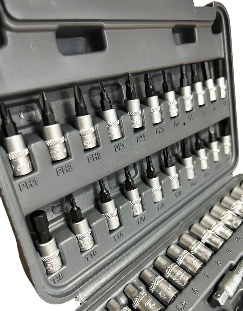 - Всі інструменти, включаючи торцеві головки 1/4″ та тріскачку, виготовлені з високоякісної хромванадієвої сталі (CrV), що гарантує довгий термін служби та стійкість до корозії.