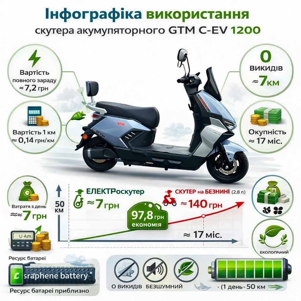 Скутер акумуляторний GTM C-EV 1200 72В 1200Вт 50км/год — це сучасний електроскутер для міста, який поєднує економічність, надійність та комфорт. Завдяки двигуну 1200 Вт, запасу ходу до 60 км та максимальній швидкості 50 км/год — ідеально підходить для щоденних поїздок на роботу або у справах.