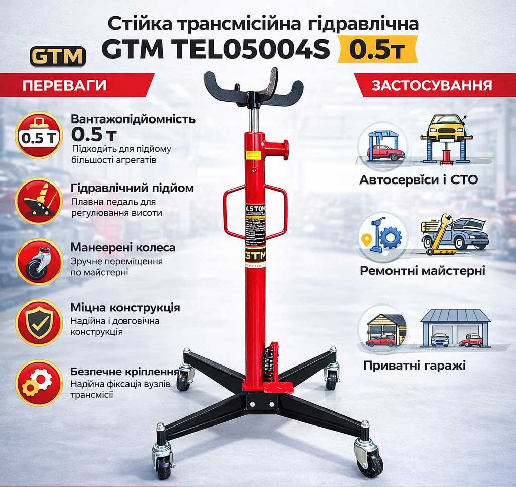 Якщо вам потрібна трансмісійна гідравлічна стійка 0.5т для ефективної та безпечної роботи, модель GTM TEL05004S стане оптимальним вибором. Вона поєднує в собі надійність, простоту експлуатації та доступну ціну, що робить її одним із найкращих рішень для автосервісу.
