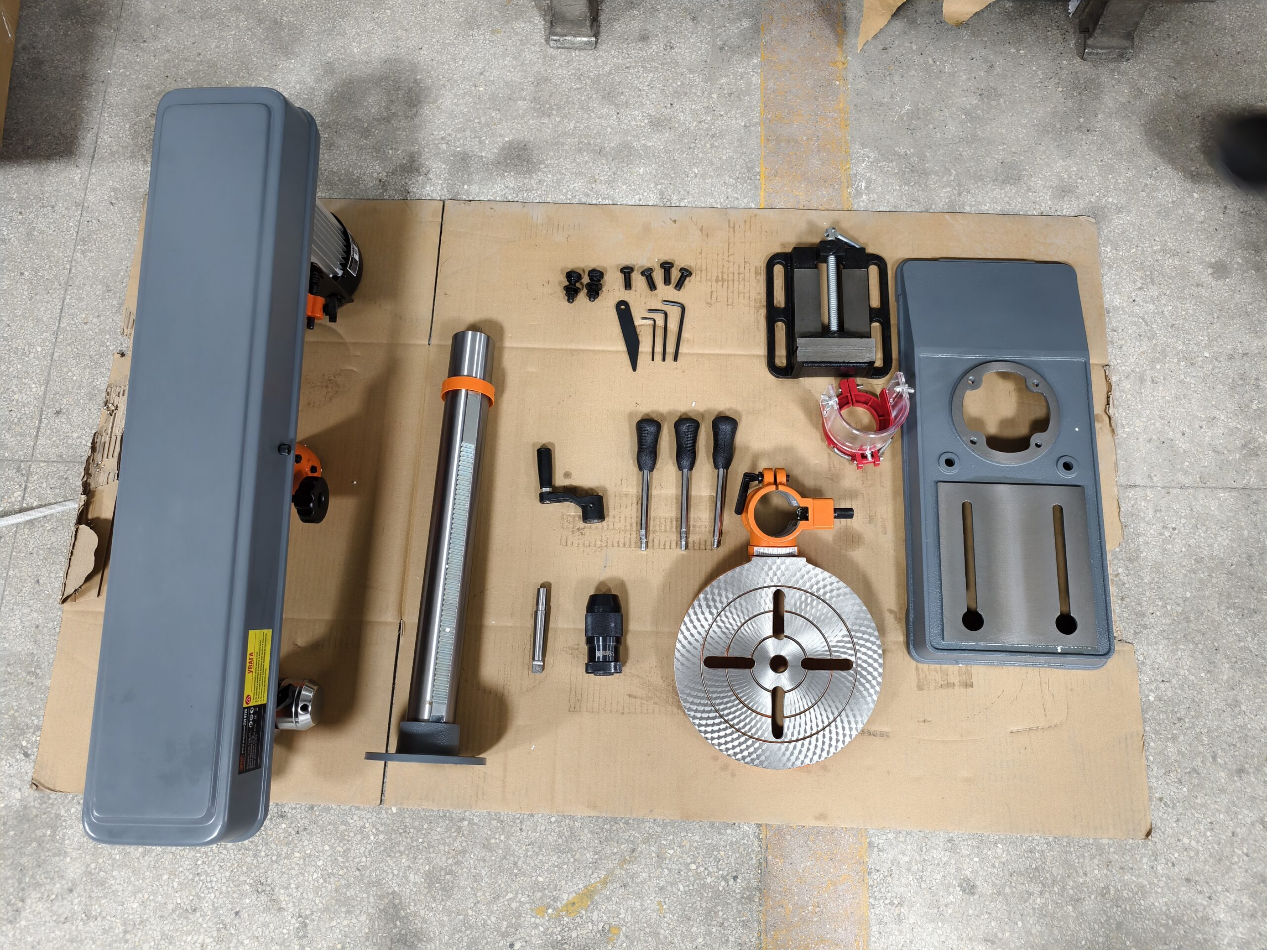 • Регулювання: Робочий стіл діаметром 260 мм регулюється в діапазоні 150–390 мм від шпинделя, з можливістю нахилу до 45 градусів для різноманітних кутів свердління.