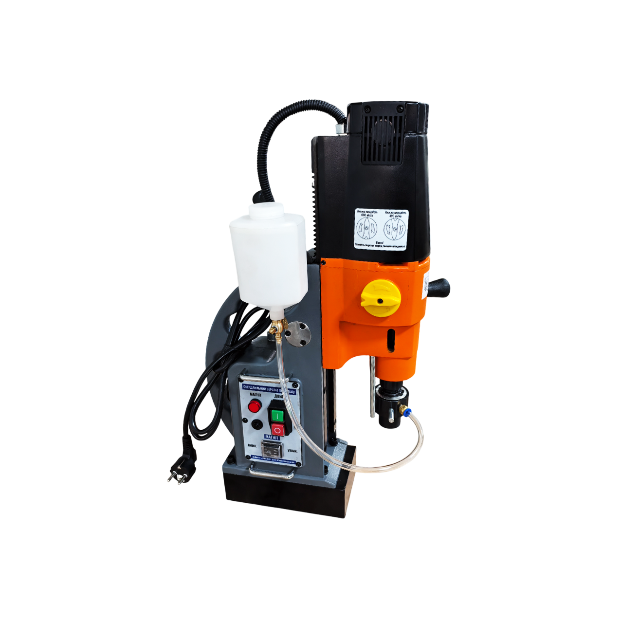 - Електромагніт з силою притягування 15000 N гарантує надійну фіксацію на металевій поверхні, запобігаючи зміщенню під час роботи.